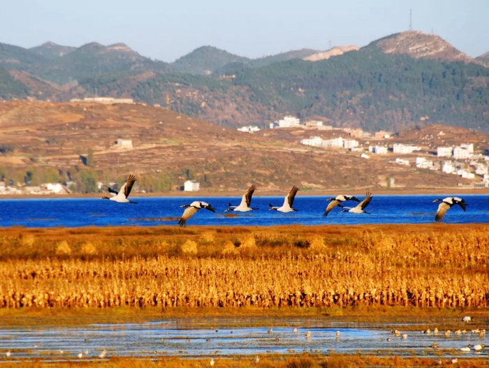 △贵州威宁草海上空的黑颈鹤/视觉中国