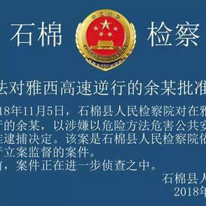 11月5日,石棉县人民检察院发布《案情通报》表示,2018年11月5日,石棉县人民检察院对在雅西高速公路上逆行的余某,以涉嫌以危险方法危害公共安全罪依法作出批准逮捕决定。该案是石棉县人民检察院依法对公安机关进行立案监督的案件。目前,案件正在进一步侦查之中。