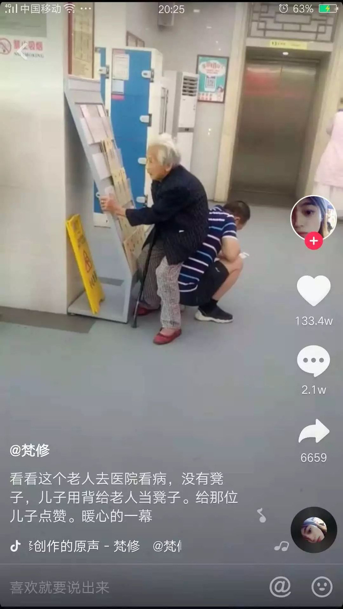 事情发生在今年中秋节前一个上午,江西南昌一家医院里,一名中年男子用背给84岁的老母亲当凳子。