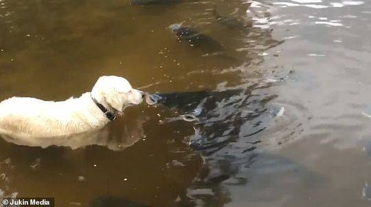 这是一个令人难以置信的时刻,一只顽皮的金毛犬熟练地从密西西比的一个湖中捕获了一条巨大的鲶鱼。