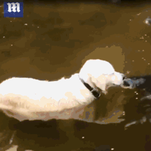 这只顽皮的小狗现在满身是泥,甚至还跟着鱼儿回到水里,看着鱼群和它放生的朋友团聚。