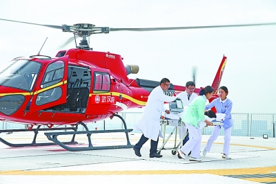 俯瞰亚心总医院,一眼就能看到一个巨大飞碟状的停机坪,它是华中地区荷载量最大的空中救援高架直升机场。橙色的空中救援直升机,就像空中“120”,配备有呼吸机、除颤监护仪等专业医疗设备,可在快速转运的同时,最大限度地保障患者的生命体征平稳,与“人”“120车”组成立体急救系统,有效弥补救援时间紧迫、救护车无法到达情况下的救援。
