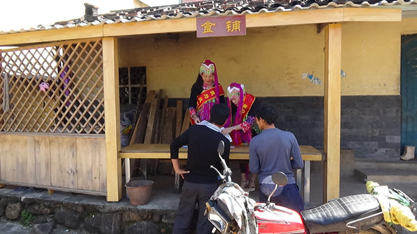 图为瑶族反邪志愿者在瑶寨食铺对路过的瑶胞开展反邪教宣传。