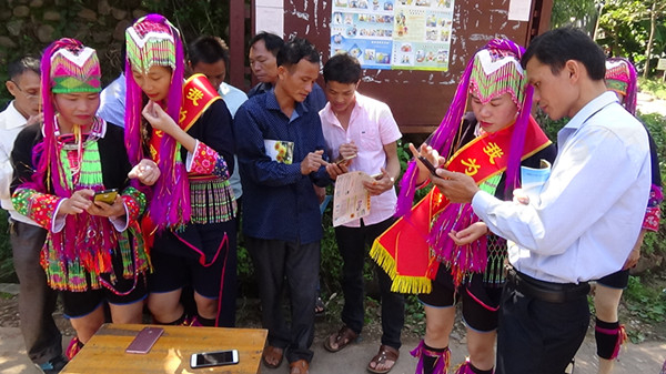 图为瑶族反邪志愿者指导瑶胞使用手机进行网络签名。