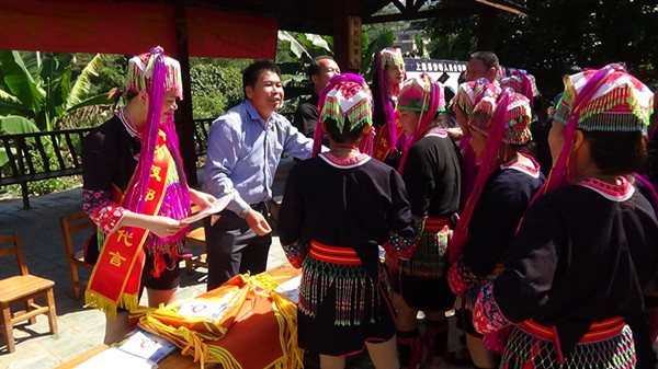 图为工作人员和反邪教志愿者向瑶胞发放反邪教资料。