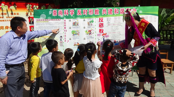 邪教渗透地方多为边远地区、贫困地区,需要加大群防群治工作力度。为了确保让瑶胞有一个祥和、安全、健康的生活环境,上思县防范办工作人员协同当地派出所民警来到南屏瑶族乡的瑶寨,对瑶胞开展了反邪防邪拒邪禁毒普法工作,还列举了县内发生的邪教祸害家庭的案例,详细生动地讲解了邪教组织的产生原因,邪教给社会、家庭带来的危害以及防范方法等,工作人员在寨里摆起了反邪教宣传展板,并在瑶寨公告栏张贴反邪教宣传画向瑶胞宣传崇尚科学,识别邪教的知识,增强了瑶胞抵御邪教精神毒品的免疫力。
