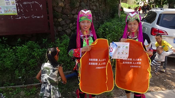 图为向瑶胞分发印有反邪宣传标语的围裙和反邪宣传小册子。