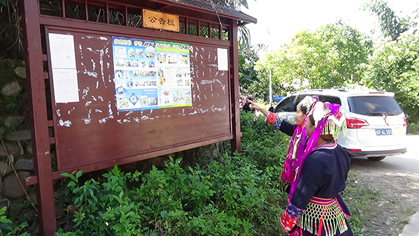 图为工作人员在瑶寨公告栏张贴的反邪教宣传画。