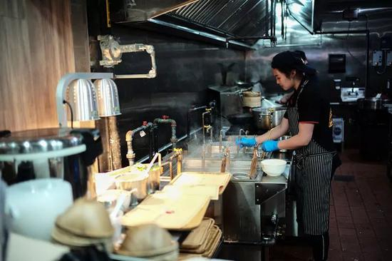 作为店长,邵彬芳每天早上7点到店,带领厨师熬制头一天腌好的汤剂,还要准备芝麻酱、辣椒酱等新鲜调味料。8点开门营业后,她便马不停蹄地迎客接单,直到12小时后,客流量稍小些,才离开店面,天天如此,日复一日。