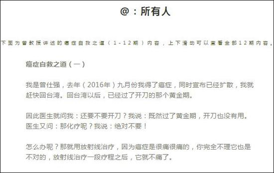 也正是同年9月,曾教授因积劳成疾,不得不卧床修养。自那以来,他多次用自己的亲身经历现身说法,向大家讲述面对病魔的自处之道,一如平日里幽默风趣,笑看人生。