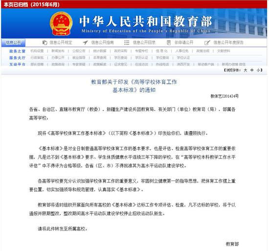 早在2014年,教育部就印发《高等学校体育工作基本标准》。凡是达不到《基本标准》要求、学生体质健康水平连续三年下降的学校,在“高等学校本科教学工作水平评估”中不得评为合格等级,各省(区、市)不得批准其为高水平运动队建设学校。