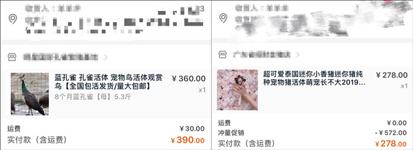 他原以为自己只是下单了两套衣服,没想到第二天清醒后打开淘宝准备查看物流信息时,突然发现“宠物小香猪”和“8个月雌性蓝孔雀”这两单订单,赫然躺在“待发货”一栏中。