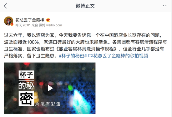 突如其来地,一则网络微博在酒店业界和消费者群体中炸开了锅。网名为“花总丢了金箍棒”的人士发文指出:“过去六年,我以酒店为家。今天我要告诉你一个在中国酒店业长期存在的问题,波及面接近100%,就连口碑最好的大牌也未能幸免。各集团都有客房清洁程序与卫生标准,国家也颁布过《旅业客房杯具洗消操作规程》,但全行业几乎都没有严格落实,留下卫生隐患。”