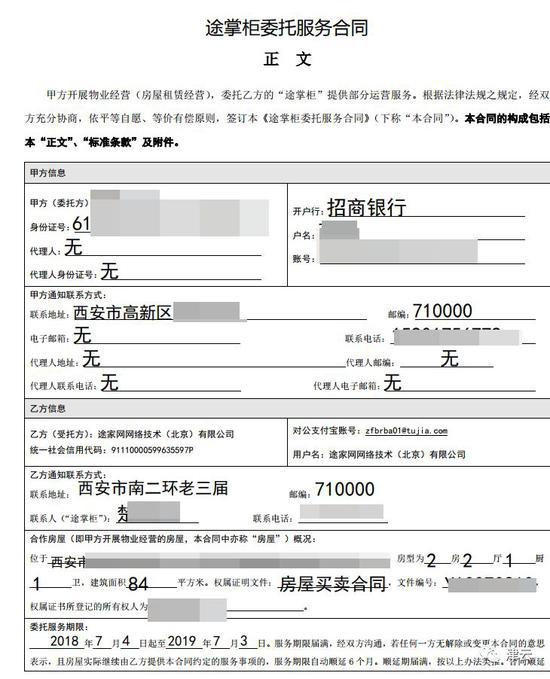 津云记者发现,途家网和戴倩签订的委托服务合同中,乙方(受托方)是“途家网网络技术(北京)有限公司”,而乙方的联系地址是西安市南二环老三届。津云记者通过乙方的联系地址查询发现,途家网网络技术(北京)有限公司联系地址是北京市顺义区北务镇政府街9号-251,并非在西安。