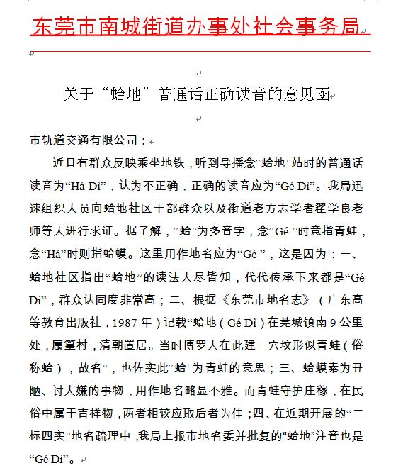 从市民政局社会事务科了解到,地名叫法应尊重当地居民习惯用法和群众意愿,并与有关各方协调一致。目前,南城街道社会事务局已去函市轨道交通有限公司,建议纠正“蛤地”的普通话读音。