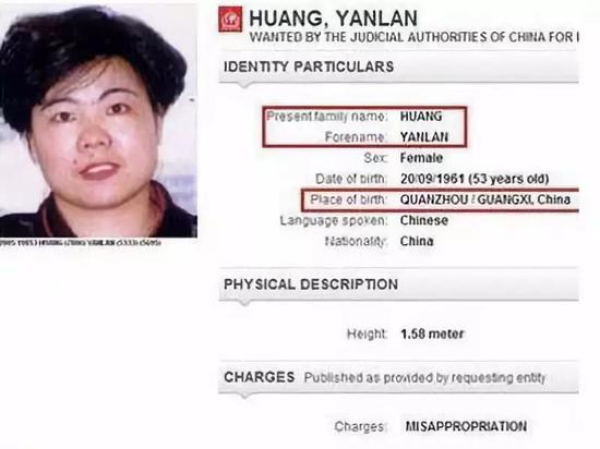2015年4月22日,国际刑警组织中国国家中心局集中公布了针对100名“红通”人员,黄艳兰在列。