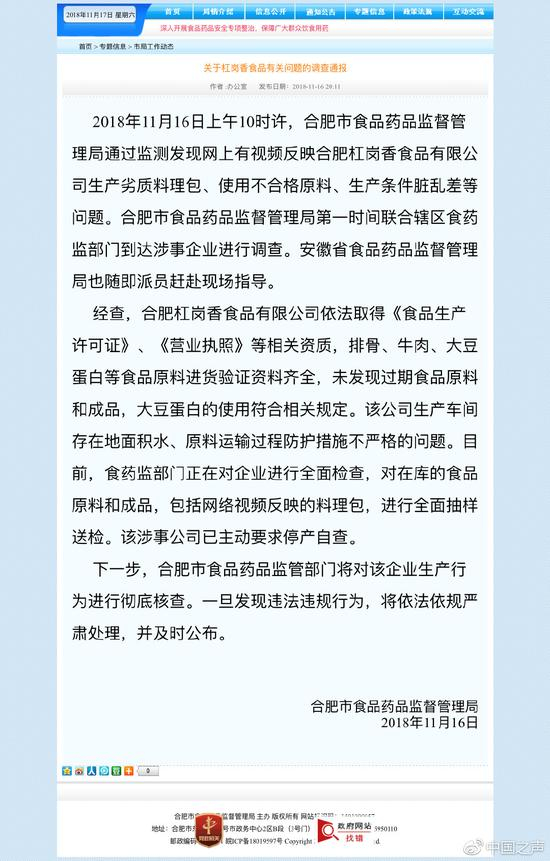 合肥市食药监局发布的关于杠岗香公司有关问题的调查通报显示。杠岗香公司依法取得了相关资质,但是该公司生产车间存在地面积水、原料运输过程防护措施不严格的问题。