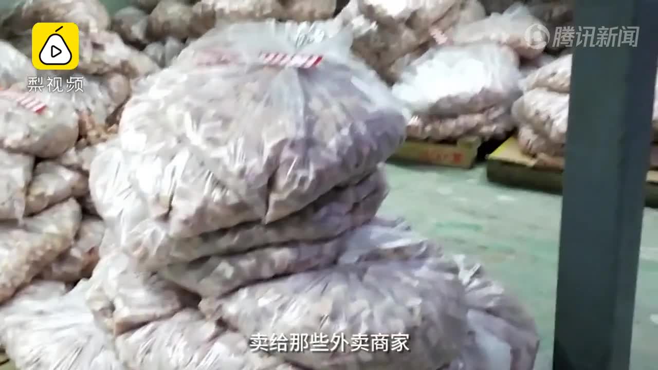 视频显示,杠岗香公司食品加工车间内,有工作人员表示,公司里的肉远低于市场价,一些排骨粒甚至储存了快一年:“进了大概十几吨,卖给那些外卖商家。能放几个月吗?这排骨粒都快放一年了,就是图便宜买的多,一下干了十来吨。”