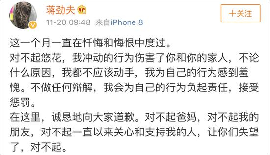 博文中,他承认自己向女友动手,一整个月都在忏悔和悔恨中度过,诚恳道歉并愿接受惩罚。