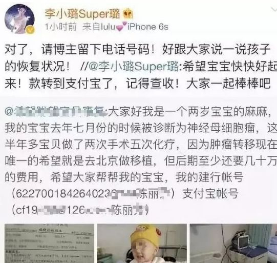 2016年3月份,网友留言说自己两岁的孩子得了神经母细胞肿瘤,需需要几十万的费用,希望李小璐能转发扩散救救她的孩子。