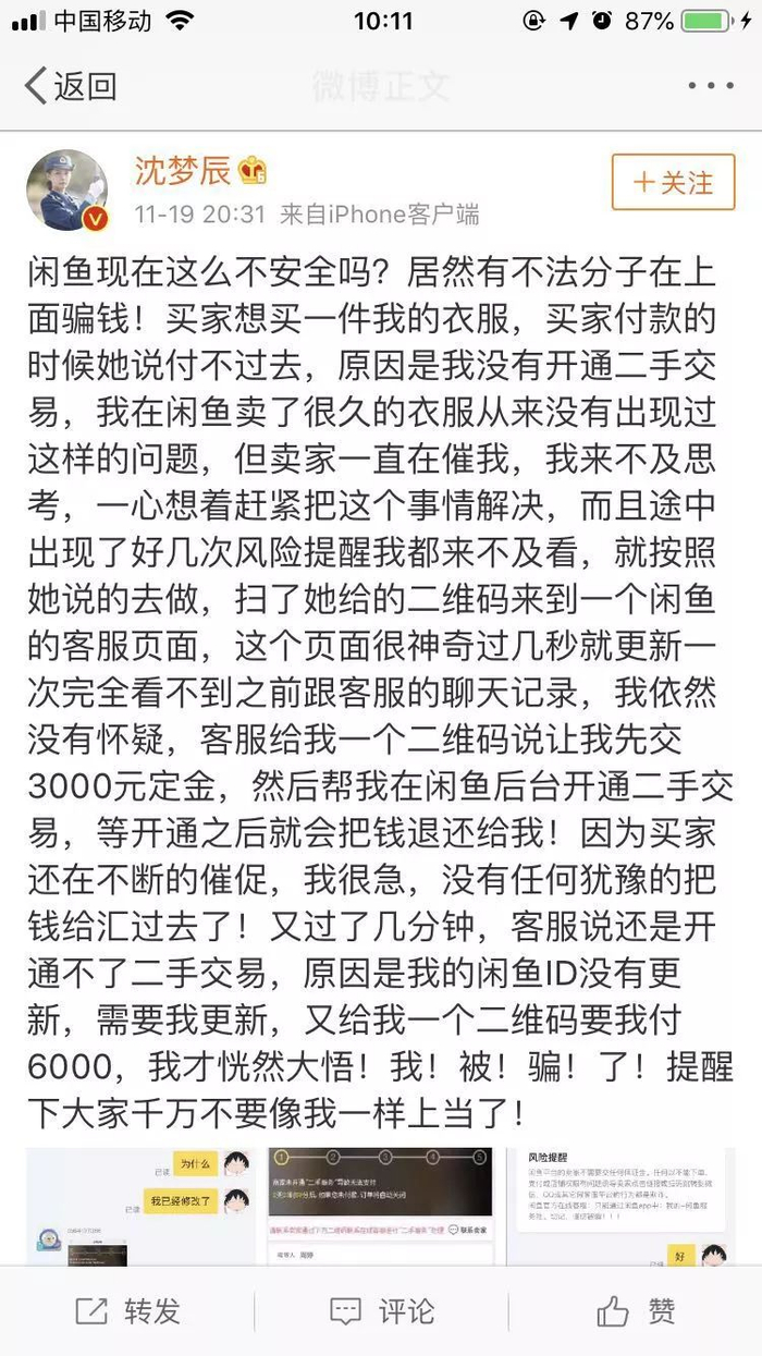 但之后客服说还是开通不了二手交易,原因是其闲鱼ID没有更新,又给一个二维码要付6000元。到了这个时候沈梦辰才恍然大悟,明白自己上当受骗了。