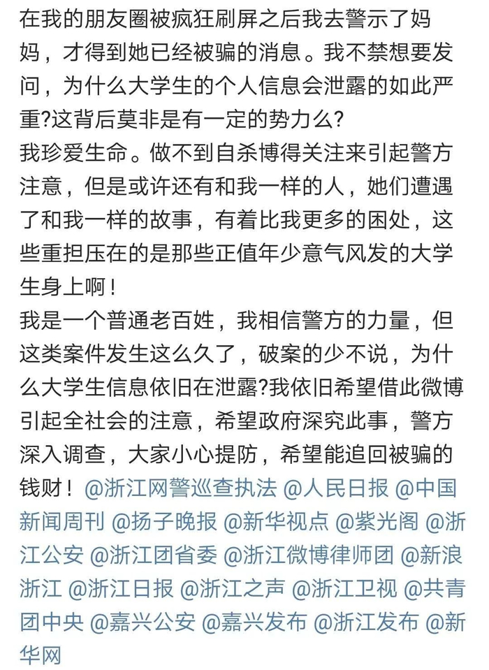 今年九月份,南京财经大学大一新生朱煜的母亲就接到过同样的短信,先后被诈骗八万余元之后,她在嘉兴市南湖建设派出所报警立案。朱煜也在微博上发帖求助,却发现了许多和她有同样受骗经历的网友。