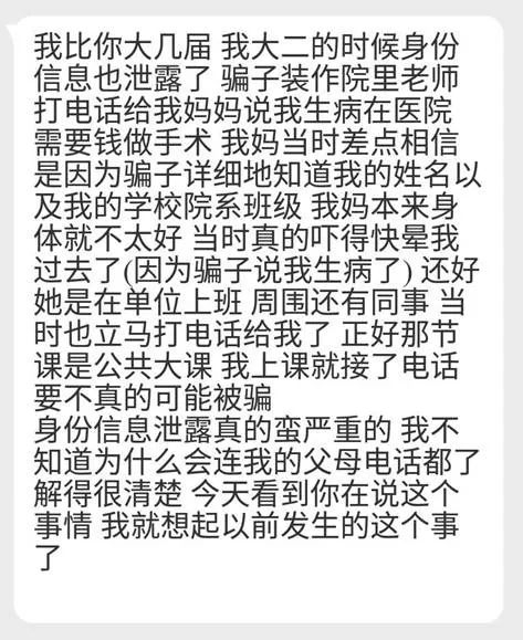 “信息泄露的源头在哪儿?这是我最想知道的。”她认为大学生信息泄露是非常需要引起社会重视的一个方面。