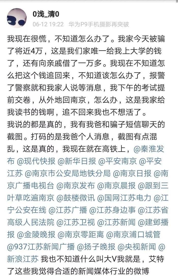 这位博主同样被骗去学费,家庭几近崩溃。她当时得到的媒体关注更多,甚至一句“找不回来我也不想活了”还被引用为新闻标题。