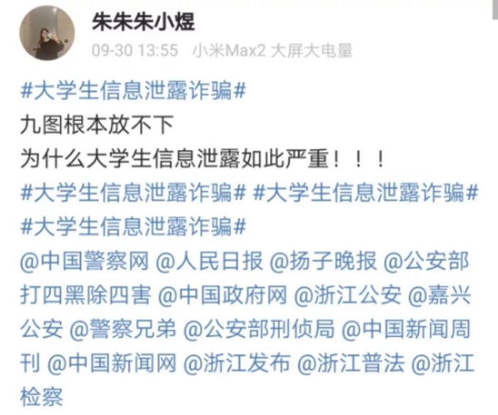 朱煜将这些令人震惊的私信内容汇总起来,之后又发布了的几条微博进行曝光和呼吁。“大学生信息泄露竟如此严重!!!”