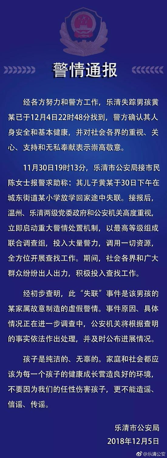 [警情通报]经各方努力和警方工作,乐清失踪男孩黄某已于12月4日22时48分找到,警方确认其人身安全和基本健康,并对社会各界的重视、关心、支持和无私奉献表示崇高敬意。
