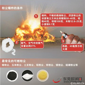 据了解,每立方米空气中含有9.7g面粉时,一旦遇有火苗、火星、电弧或适当的温度,瞬间就会燃烧起来,形成猛烈的爆炸,其威力不亚于炸弹。