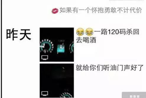 “一路120码杀回去喝酒”、“就给你们听油门声”……浙江台州路桥一90后小伙2015年11月8日的晚上发出这样的朋友圈,颇有点炫技意味,每句话还配有一段视频,画面均为汽车“生猛”的仪表盘。
