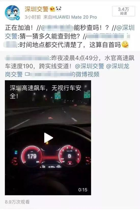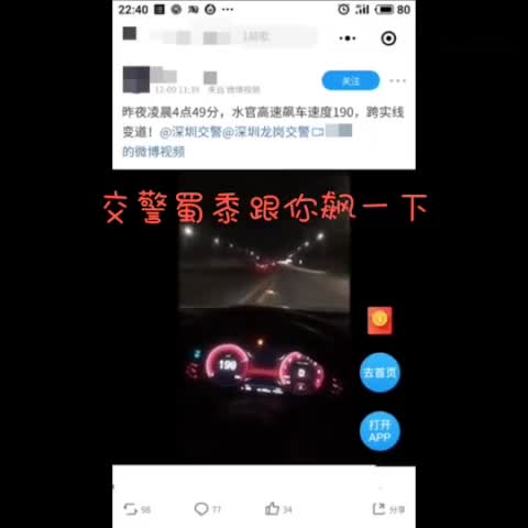 12月9日,市民通过微博@深圳交警,微博内容为一段车内拍摄的小视频,视频显示车辆在高速上快速行驶,车辆仪表盘上实时显示车速最高达到了200公里/小时,涉嫌超速驾驶。