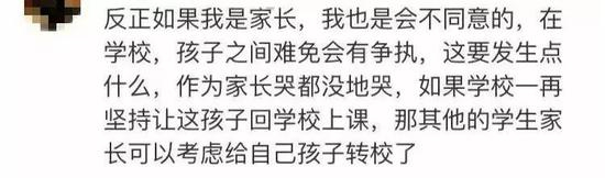 目前这个事件确实到了两难的境地。一方面,其他学生的家长认为男孩回学校后,可能会威胁到自己孩子的人身安全,从感情上是可以理解的,这种担心并不是没有道理。
