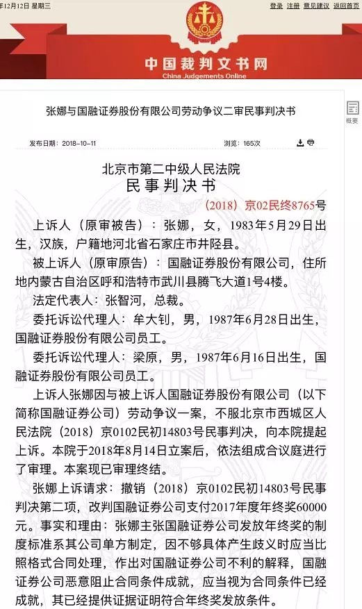 正是因为在年终奖这个核心争议中存有争议,国融证券不服仲裁裁决,于是向法院提起诉讼。