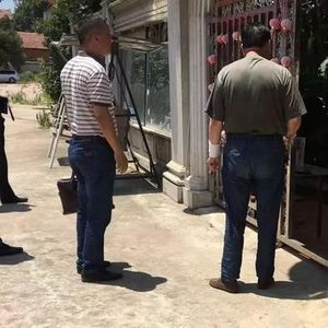 ▷“握手”3个月后,戴着护腕的盛福林站在涂汉江别墅门口,摄于2017年7月(翻拍)