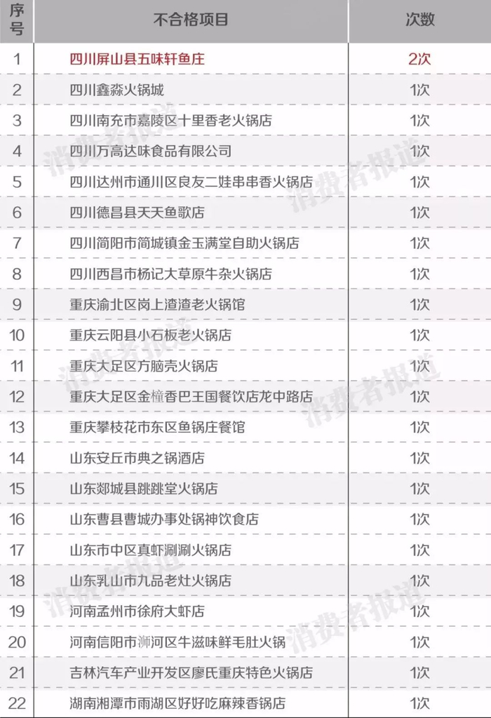 在23批次不合格的火锅底料中,四川省屏山县五味轩鱼庄登榜2次,涉及火锅底料油(散装)、火锅底料(统一配送散装)两种产品。