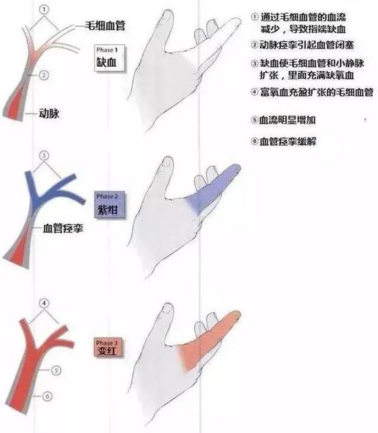 其早期血管病变表现以痉挛为主,手指等处受冷刺激后血管痉挛,导致缺血,出现肢段颜色发白、变紫,发作时伴有局部麻木或刺痛感的症状。