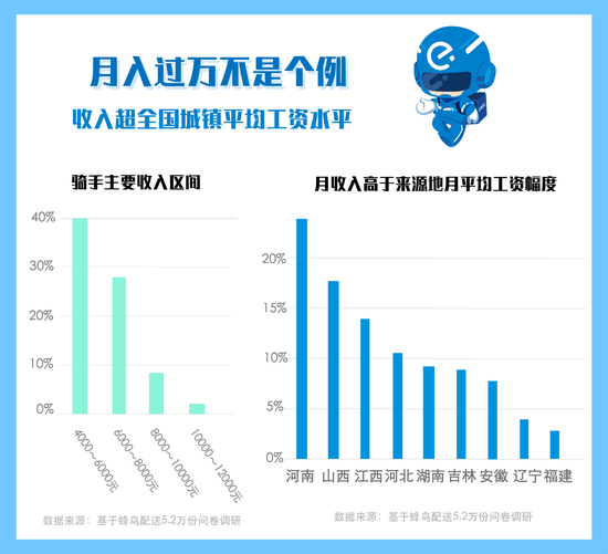 据《报告》统计,蜂鸟骑手收入主要集中在4000—8000元(包含兼职与专职骑手),超过了2017年全国城镇私营单位就业人员月均薪资3813.4元。在河南,做骑手的工资甚至比2017年当地城镇私营单位就业人员的工资高出24%。
