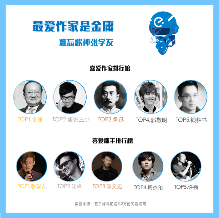除了物质回报,外卖骑手的精神生活同样丰富多彩。他们最喜欢的作家是金庸、唐家三少和鲁迅。有1%的蜂鸟骑手爱读博尔赫斯、杜拉斯,2%骑手喜欢王小波。骑手最爱歌手TOP3是张学友、汪峰和陈奕迅。此外,0.1%的人是蔡徐坤的死忠粉,6%的人钟爱腾格尔。