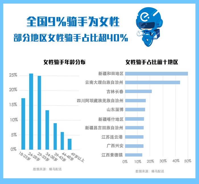 77%蜂鸟骑手来自农村,他们通过送外卖自食其力,在城市扎稳脚跟。有9%的骑手为女性,在云南、吉林、四川等地,女性骑手的占比都超过了全国平均水平。