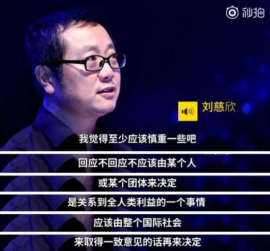 有媒体采访了科幻作家刘慈欣,他表示是否回应应该由国际社会来决定: