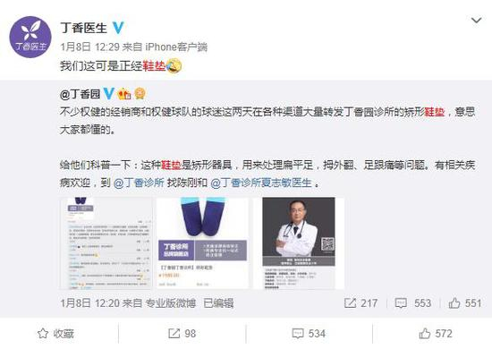 1月11日,一篇自媒体文章,再次将争议炒热。该文指出,丁香园微博曾转发“新华社曝光南京一家公立医院卖天价鞋垫”的新闻,但丁香诊所在售的鞋垫同为“天价”,文章称这是“双标”(注:双重标准)。