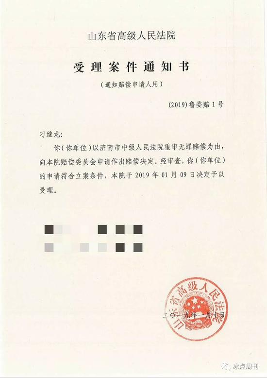 山东省高院的《受理案件通知书》显示,1月9日,山东省高院正式受理了刁继龙的国家赔偿申请。