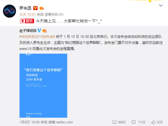 今天晚间,快如科技2019发布会将在北京举行,主题为“我们想跟这个世界聊聊”。外界猜测,老罗将在今晚的发布会上正式推出“聊天宝”。