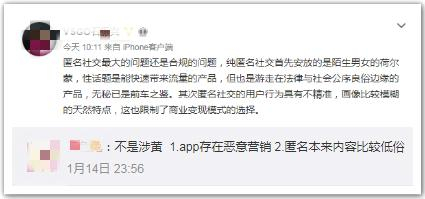 而作为一款主打匿名社交的社交产品,用户还质疑了目前匿名社交可能存在的合规问题。