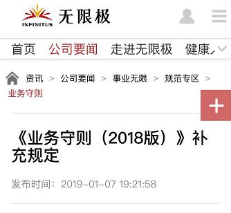 在天津“权健”被调查后,2019年1月7日,无限极曾在其官网刊发“规范经营诚信自律”《业务守则(2018版)补充规定》。