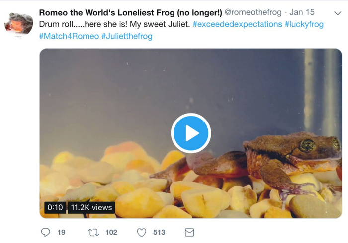 而有着自己推特账号的罗密欧,也成为一只“网红蛙”,众多网友一直关注着罗密欧的脱单历程。