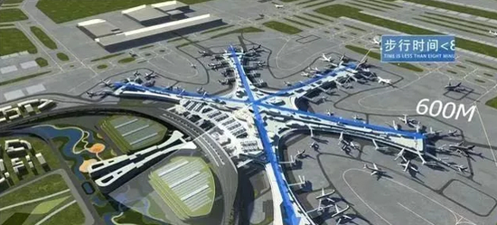新航站楼综合体设计了双进双出的模式,提高了旅客的出行、换乘效率。从下车处到登机口距离是600多米,走路最多8分钟就能登机,而且,地下还有高铁,完全实现零换乘。