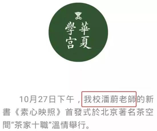 2018年底,华夏学宫的官网上刊登了一则关于潘蔚新书《素心映照》的首发消息。文中,潘蔚被称作“我校老师”。